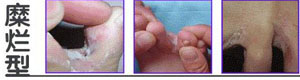 1、糜烂型脚气:好发于第三与第四,第四与第五趾间。初起趾间潮湿,浸渍发白或起小水疱,干涸脱屑后,剥去皮屑为湿润、潮红的糜烂面,有奇痒,易继发感染。