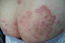 2、体股癣是发生于腹股沟、大腿内侧上部及外阴部的癣病。较常见的部位是阴囊对侧的大腿皮肤,损害初起为一小片斑丘疹,色红,表面可出现小鳞屑。随后皮疹扩大,向四周逐渐蔓延,形成环状或半环状斑片。一般夏季加重,冬季皮损明显减轻。